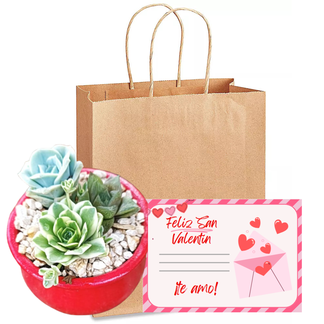Hermoso mix de suculentas, sembaradas en una brillante maceta color rojo y decorada con piedritas elegantes de color blanco, incluye un letrero en forma de corazón con la frase «TE AMO». Incluye tarjeta de dedicatoria y bolsita ecológica.