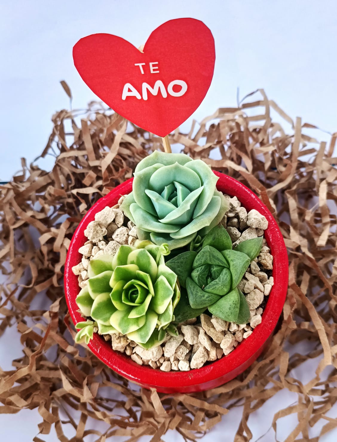 Hermoso mix de suculentas, sembaradas en una brillante maceta color rojo y decorada con piedritas elegantes de color blanco, incluye un letrero en forma de corazón con la frase «TE AMO» y chocolates Ferrero Rocher de 3 unidades. Incluye tarjeta de dedicatoria y bolsita ecológica.